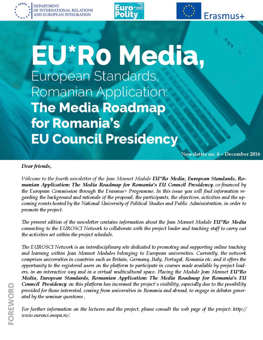Welcome to the fourth newsletter of the Jean Monnet Module EU*Ro Media, European Standards, Romanian Application: The Media Roadmap for Romania's EU Council Presidency, co-financed by the European Commission through the Erasmus+ Programme. In this issue you will find information regarding the background and rationale of the proposal, the participants, the objectives, activities and the upcoming events hosted by the National University of Political Studies and Public Administration, in order to promote the project.